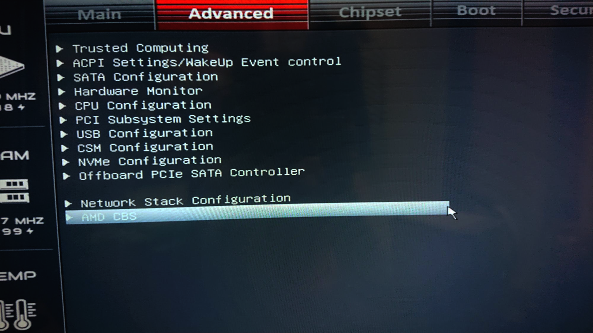부팅시, DEL키를 연타하여, 바이오스진입 -> ADVANCED -> AMD CBS 이동