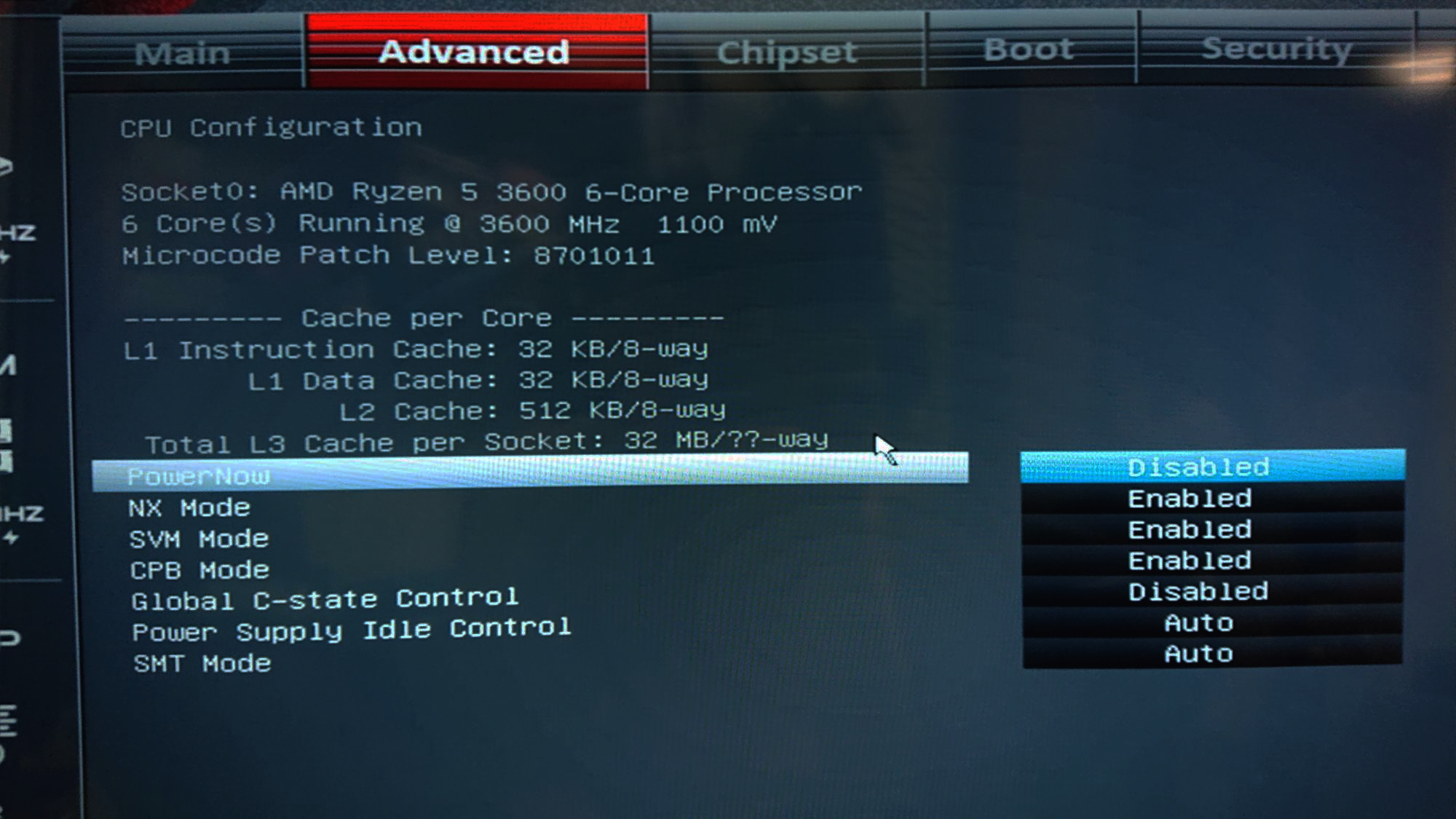 CPU CONFIGURATION에서 POWERNOW(쿨엔콰이어트 기능)와, C-STATE CONTROL은 비활성화해줍니다.
